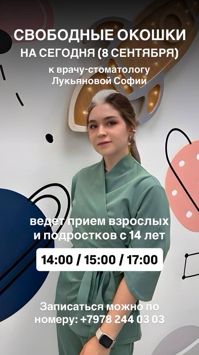 На сегодня есть свободные окошки к врачу-стоматологу Лукьяновой Софии 🦷