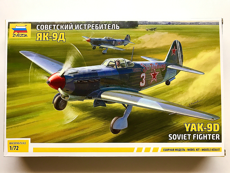 =============================== Имеем набор от "Звезды" - Як-9Д серии "сборка без клея". Коробка в которой поставляется данный кит-набор, выполнена в дизайне 2-ой итерации всё с тем же красочным боксартом Андрея Жирнова. Однако, с лицевика исчезли надписи "СБОРКА БЕЗ КЛЕЯ" и красный кругляшок "МОЯ ПЕРВАЯ СБОРНАЯ МОДЕЛЬ". В коробке из довольно мягкого картона с боковыми клапанами находятся: два литника серой пластмассы(*в запаянном пластиковом пакете) на 57 деталей, фонарь (в zip-пакете вместе с листом декалей), декаль на 3 варианта, ч\б иструкция на листе А3, вкладыш и цветной листок со схемой окраски. За два с половиной года пресс-формы всё ещё выдавали отливки хорошего качества. Однако, незначительный облой на некоторых деталях всё же имеется, есть пару утяжин (вроде как, не критично). Расшивка тонкая, чёткая и лаконичная. С общей геометрией по отношению к прототипу, - проблем быть не должно. Хорошо отображена имитация провиса на фюзеляже. Остекление фонаря дано