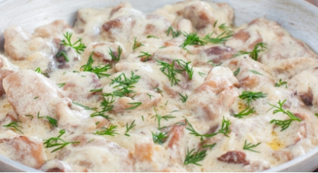 Ингредиенты: На 1 порцию: - 200 г грибов - 2 ч. л. жира - 2 ст. л. сметаны - 0,5 ч. л. муки - 3 г зелени Приготовление: Грибы почистить, тщательно вымыть, залить кипятком, после чего слить воду через сито. После стекания жидкости порезать их кусочками и выложить на горячую сковороду с жиром, посолить. Жарить 15-20 минут, регулярно перемешивая, потом посыпать грибы мукой, снова перемешать и добавить сметану. Прокипятить. Перед подачей украсить мелко нарезанной свежей зеленью петрушки либо укропа.