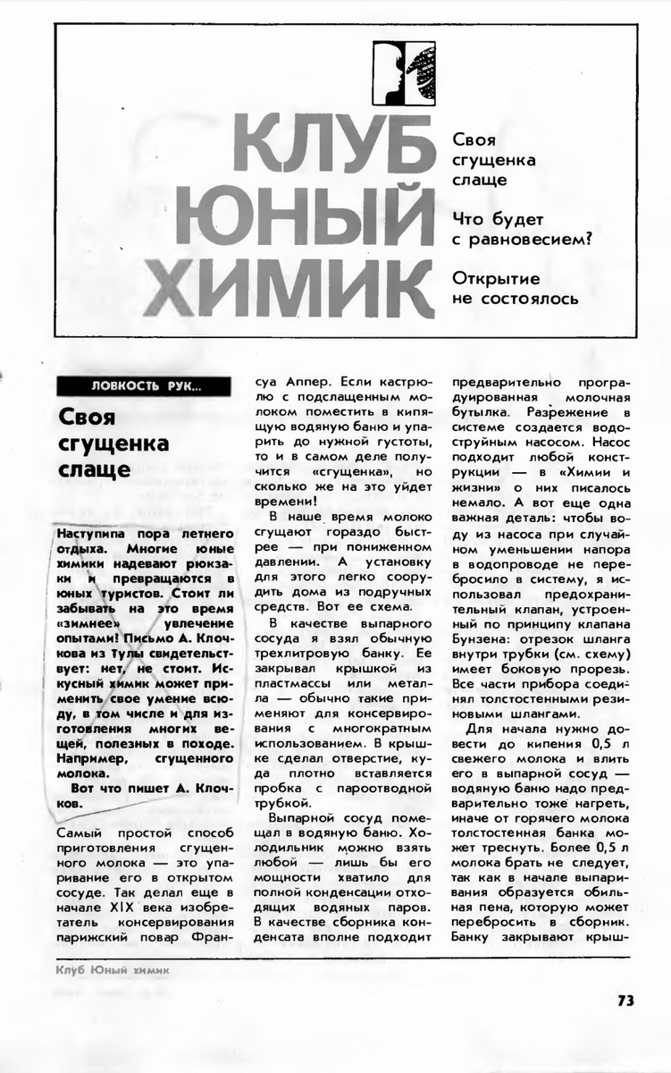 - так называлась статья журнала «Химия и Жизнь» N7 за 1981 год (см. картинки к посту) - в ней рассказывается как в домашних условиях быстро приготовить всем известный сладкий деликатес: сгущённое молоко. Не смотря на то, что покупная сгущенка во времена СССР была исключительно натуральной и очень вкусной, а цена её была всего 55 копеек за банку 0,5 л, этот домашний способ её приготовления был популярен в СССР. Думаю, в наше время, когда «натуральную сгущёнку» нередко делают из пальмового масла и всякой другой химической дряни, а космическая цена на всё и вся далеко не гарантия качества, этот способ заинтересует немало умельцев. Действительно, ведь если захотеть, то своя сгущёнка будет и слаще и гуще - ибо сахара в неё можно добавлять сколько душе угодно, а упаривать её можно хоть до густоты мармелада...😊 Конструкция аппарата не сложнее самогонного и может быть совершенно другой, тут раздолье вашему воображению и умелым рукам. Вместо 3 литровой банки, для увеличения объёма получаемой