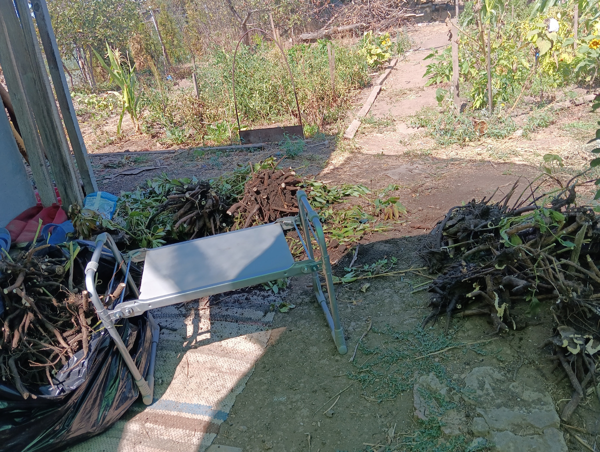 Главным занятием вчера для нас стало очень нелёгкое дело: выкопать многолетние пионовые кусты, очень давно высаженные прежними владельцами вдоль дорожек.