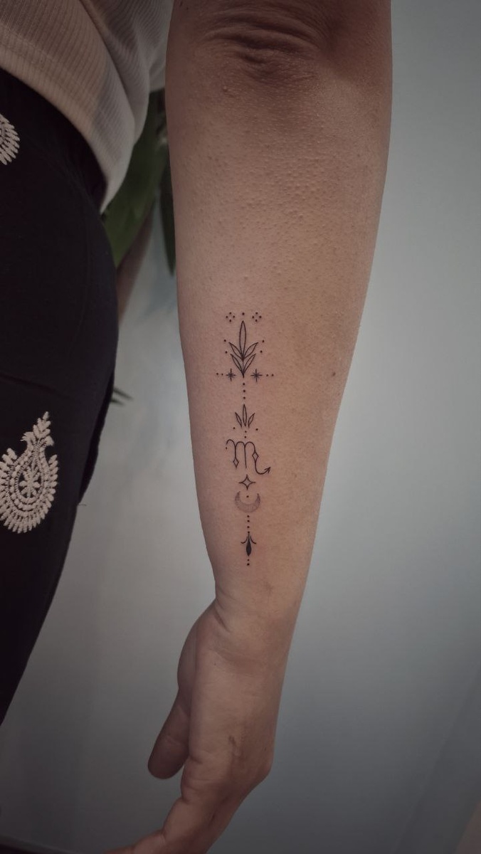 ✨ Минимализм, линии и сакральные символы. На фото — татуировка с акцентом на знак Скорпиона, дополненный лунной символикой, точками и орнаментальными элементами. Такой рисунок работает как личный код: — Скорпион даёт силу трансформации, глубину чувств и умение идти до конца. — Луна — связь с интуицией и внутренними циклами. — Орнамент сверху и снизу — защита и баланс, будто рамка для личной энергии. Это тонкая печать характера: для тех, кто умеет быть глубоким, честным и не боится смотреть вглубь себя. Написать мастеру http://t.me/alexandradulchy Тату.Смысл.Образ. Сколько стоит - сакральные миниатюры от 10тыс