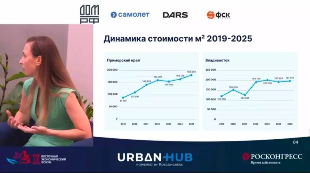 Об этом говорит зампредседателя Правительства Приморского края Ольга Иванникова на площадке Урбан Хаб. «Достаточно долгое время у нас строились проекты без инфраструктуры. Но люди уже не хотят покупать просто квадратные метры. Им нужно, чтобы среда была обеспечена социальной, инженерной и транспортной инфраструктурой». Кроме того, Ольга отметила, что Владивосток занимает 7 строчку по привлекательности для девелоперов с точки зрения развития жилищного строительства. Однако это привело к увеличению стоимости квадратного метра. «Если у нас в 2019-м по Владивостоку эта цифра составляла 123 тысячи за “квадрат”, то на сегодняшний день — 197. Показатель вырос в 1,6 раза».