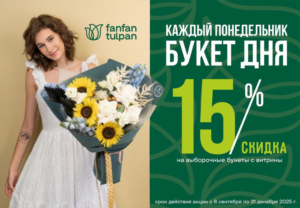 🎁 Дарить цветы без повода – не только приятно, но еще и выгодно! В сети цветочных Фан Фан Тюльпан стартовала акция - каждый понедельник скидка на букеты с витрины 15%. Выбрать можно лично в салонах сети или с доставкой, написав менеджеру @FanFTulpan Фан Фан Тюльпан– это всегда море цветов, гостеприимство, классные букеты, приятные цены на цветы и постоянные акции. Подпишись, чтобы быть в курсе и наслаждаться красотой флористики. Заказать удобным способом букет в любой недели Сайт +7(3452)51-51-71 @FanFTulpan ВКонтакте