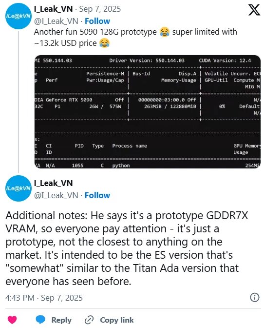 Китайские умельцы модифицировали флагманскую видеокарту NVIDIA GeForce RTX 5090, оснастив ее 128 ГБ видеопамяти GDDR7X. Стандартная версия этой карты, основанной на архитектуре Blackwell, имеет всего 32 ГБ VRAM и предназначена в первую очередь для геймеров и энтузиастов. Однако новая кастомная модель, очевидно, ориентирована на ИИ-задачи, где огромный объем памяти критически важен для обработки больших моделей машинного обучения. Замеченная видеокарта, стоит отметить, является прототипом, а не серийным образцом. Также отметим, что GDDR7X выше это не опечатка. По данным утечки от инсайдера I_Leak_VN в X (бывший Twitter), модификация достигается путем установки высокоплотных чипов памяти на двухстороннюю печатную плату. Само собой, ни у одной из продающихся версий RTX 5090 таких плат нет, а потому это уже высочайший уровень кастомизации видеокарт. Это позволяет увеличить буфер в четыре раза, делая карту идеальной для серверов и рабочих станций в Азии, где официальные ИИ-акселераторы NVID