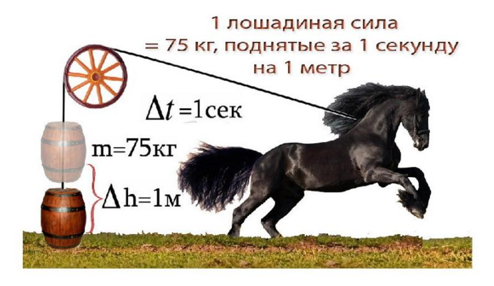Джеймс Уатт и его лошади. В конце XVIII века английский инженер Джеймс Уатт ввел понятие "лошадиная сила" для наглядного сравнения эффективности паровых машин с традиционной тягловой силой. После наблюдений за работой лошадей на угольных шахтах он подсчитал, что одна лошадь может поднимать груз весом 180 фунтов (81,6 кг) на высоту 181 фут (55,2 м) за минуту. Округлив расчеты, он установил значение механической лошадиной силы в 33 000 футо-фунтов в минуту, что равняется 745,7 Вт.