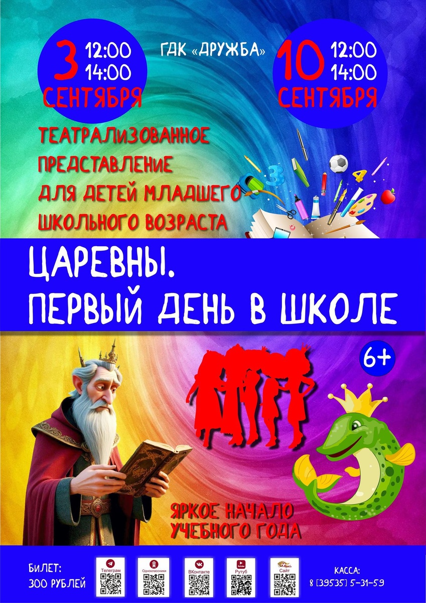 Приглашаем младших школьников на интерактивное театрализованное представление «Царевны. Первый день в школе», посвящённое началу учебного года. Вместе с Царевнами из сказочного Дивногорья зрители отправятся в увлекательное путешествие, где выяснят, зачем нужны уроки и как преодолеть трудности на пути к знаниям. Даты представлений: 3 сентября в 12:00 и 14:00 10 сентября в 12:00 и 14:00 Для учеников 1-4 классов. Стоимость билетов: 300 рублей. Касса: 5-31-59. Готовьтесь к новым школьным приключениям с Царевнами!