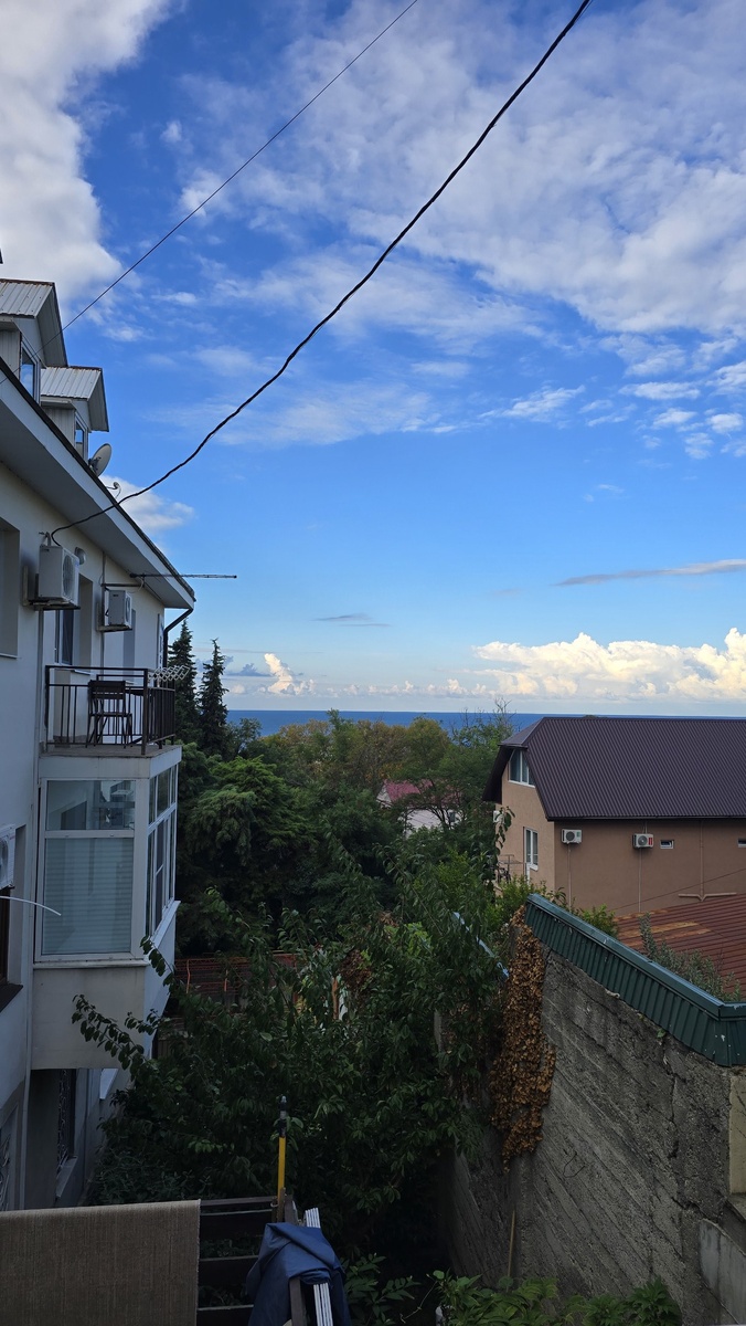 Бодрый понедельник из Лазаревского, небо ясное, но тучки наступают с Сочи. Утром +20°, вечером вчера было прохладно после дождя, есть ветер.