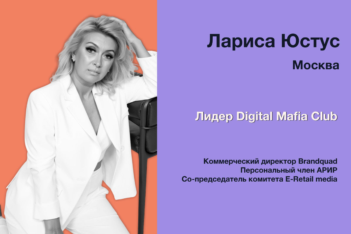 Сегодня наша гостья – Лариса Юстус. Лариса – лидер Digital Mafia Club, коммерческий директор Brandquad, персональный член АРИР и со-председатель комитета E-Retail media.