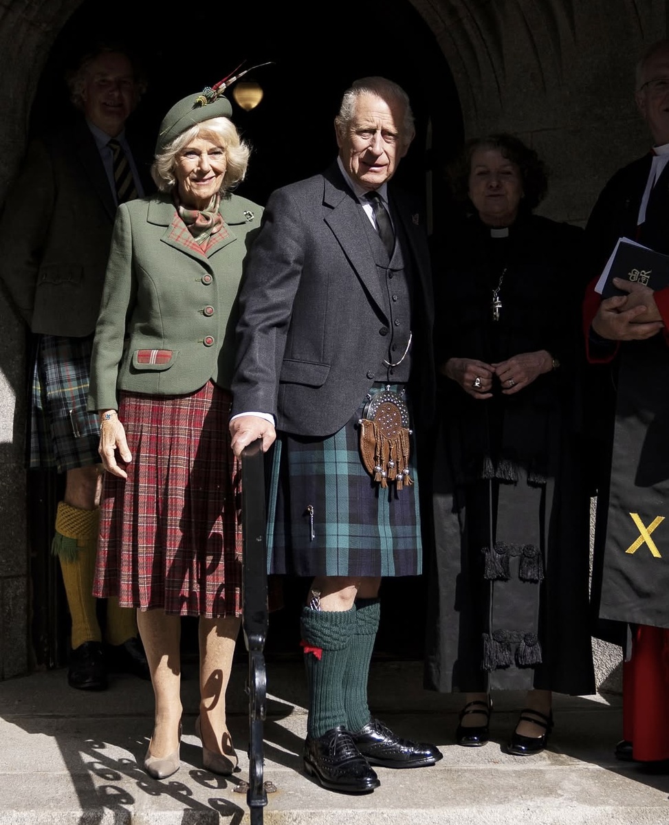 Продолжающийся отпуск Чарльза и Камиллы в замке Балморал время от времени разнообразят визиты не только беспокойных родственников, но и других особ. Король в тартане Королевского полка Шотландии, к которому присоединились в церкви Крати-Кирк королева, премьер-министр с супругой , а также актриса Джоанна Ламли. Ламли близка Камилле и входит в круг ее звездных друзей. Жена самого непопулярного премьера была в любимом ею красном и черном фетровом берете. И опять отмечу, что Камилла не носит черную одежду ( платье или жакет), который по Указу мужа и протоколу обязана! «Члены королевской семьи носят одежду, отражающую эпоху. Помощники в ливреях , придворные и военнослужащие, несущие государственную службу, будут носить чёрные нарукавные повязки». Торжественная служба отметила третью годовщину восшествия Чарльза на престол, а также поминальные молитвы за герцогиню Кентскую. Странно, что не сообщается о поминальных молитвах в честь Елизаветы, возможно, будут отдельно сегодня?