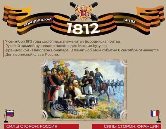 🗓 ДЕНЬ В ИСТОРИИ 213 лет назад, 7 сентября (26 августа по старому стилю) 1812 года состоялось одно из самых кровопролитных однодневных сражений в истории человечества – легендарная битва при селе Бородино. .......................... До сих пор существуют различные точки зрения на то, кто все-таки одержал в нем победу, ведь и в России, и во Франции Бородинскую битву считают своим триумфом. Однако практически не подвергается сомнению то обстоятельство, что благодаря мужеству и героизму русских солдат и полководческому талану Михаила Илларионовича Кутузова при Бородино миф о непобедимости войска Наполеона Бонапарта был развеян. Русская армия нанесла французам и их союзникам огромный ущерб и в конечном итоге изгнала вторгшегося захватчика из страны. 🏛 Подписаться!
