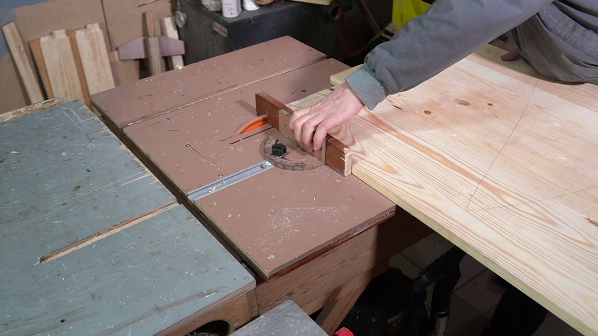 Первую часть смотрите здесь Вторую часть смотрите здесь Третью часть смотрите здесь Четвертую часть смотрите здесь Возвращаюсь к заготовке для столешницы. Для начала нужно обрезать щит в размер 900 на 600 мм. Это можно сделать ручной циркулярной пилой по направляющей или же использовать распилочный станок и обрезать щит по параллельному и угловому упору. С угловым упором была использована небольшая хитрость. Обычным способом использовать угловой упор не получалось, потому что ширина столешницы значительно превышает расстояние до пильного диска. Но если угловой упор перевернуть в направляющей и упереть в него широкую заготовку, то обрезать неровный край щита получится. Далее столешницу нужно отшлифовать. Здесь сначала использовалась ленточная шлифмашинка, а затем орбитально шлифовальная машинка. Осталось ещё несколько этапов работы. Сначала склеивается основание стола и пока клей подсыхает фрезеруются кромки столешницы и изготавливается детали для крепления столешницы к основанию. При с