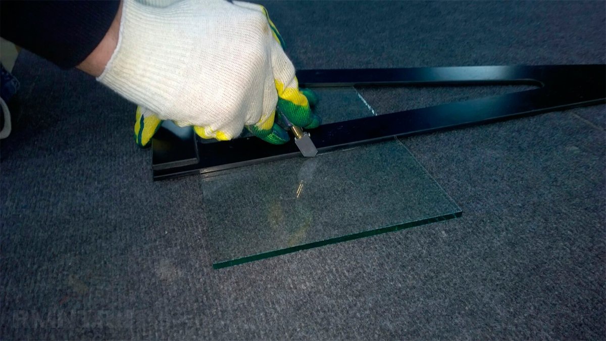 Первое — мягкая поверхность стола, к которой листом стекла не могут быть прижаты пылинки и песчинки. Для профессионалов рекомендуются щёточные плинтусы, для разовой работы сгодится старый ковер или мягкая плотная простынь. Размер стола должен позволять поместить деталь как минимум на 2/3 площади, при этом линия реза должна целиком находиться на столе.