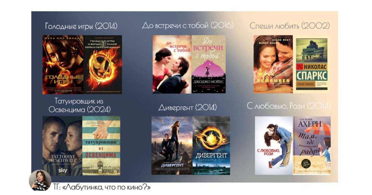 Книга или фильм? 🤩 А зачем выбирать, если хороши оба варианта! 📎 Каждый год нас радуют большим количеством экранизаций, но только единицы можно назвать поистине хорошими. Мы с моей подругой Леной и по совместительству админом канала «Хочу и всё» объединились и решили составить собственный список хороших экранизаций. ♥️Как видите, я тяготею к любовным историям, которые проходят испытания. Мне нравится чувствовать и вдохновляться красивыми историями. — А подборка у Лены про путь к самому себе и личную трансформацию, где фильм или книга дают пищу для размышлений. Мы разные, но это прекрасно! Её выбор - замечательный. Люблю все эти фильмы ♥️ 📹Какие ваши любимые экранизации? Делитесь с нами! #подборка