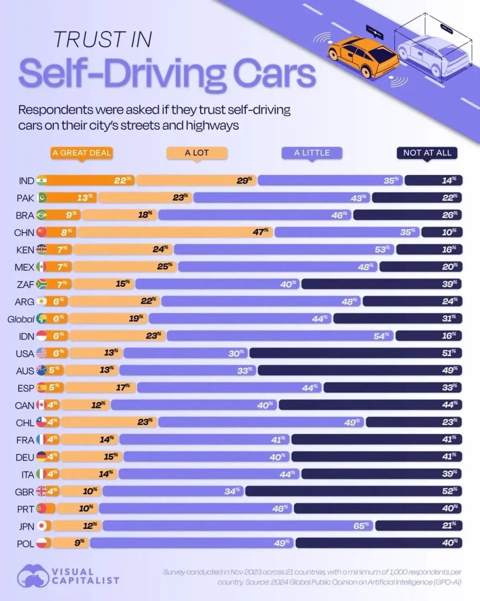 Индия и Китай демонстрируют оптимизм в области беспилотного транспорта Индия и Китай — большие фанаты беспилотных машин! Более половины опрошенных в Индии и 60% в Китае верят в их успех. А вот в США, Британии и Австралии народ как-то побаивается роботов-водителей — больше половины не доверяют им вообще. Забавно, да? 🗞 Подробнее: pux.su 🏞 Фото от: naked-science.ru 🔔 Подписывайтесь на нас: pux_news
