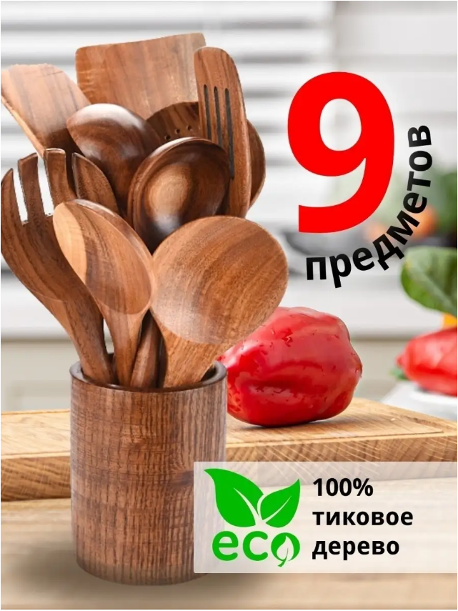 Я всегда думала, что главное в готовке — это талант, но на самом деле удобные и красивые инструменты решают половину проблем. Всё, что нужно для готовки, — в одном комплекте: 9 предметов из тикового дерева. Лопатки, ложки, шумовка и даже подставка. Они безопасные, долговечные и, что самое важное, не царапают посуду. А еще они выглядят очень стильно и натурально.