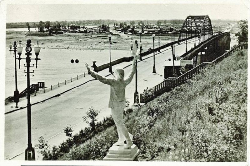 В архивных кадрах Арочного моста можно увидеть скульптуру девушки с голубем - олицетворение мира и дружбы