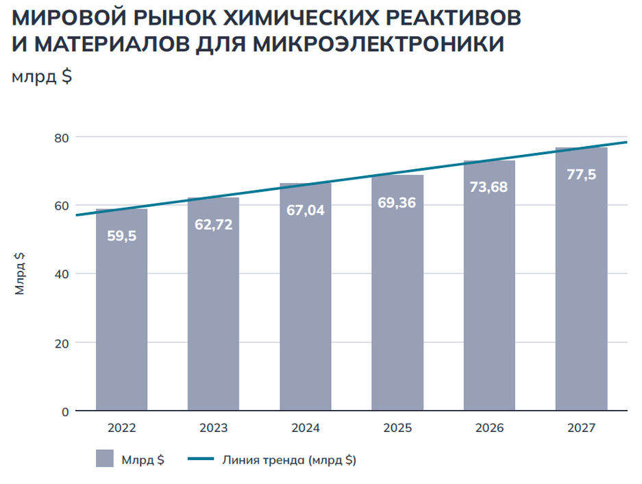 Глобальный рынок электронных химических веществ и материалов в 2022 году составил 59,5 млрд долларов. По оценкам официальных данных и закупочным ценам, в 2023 году рынок достигнет 62,72 млрд. При этом рынок достигнет 77,5 млрд долларов к 2027 году, увеличившись на 18 млрд при CAGR 5.4% за прогнозируемый период с 2022 по 2027 год.