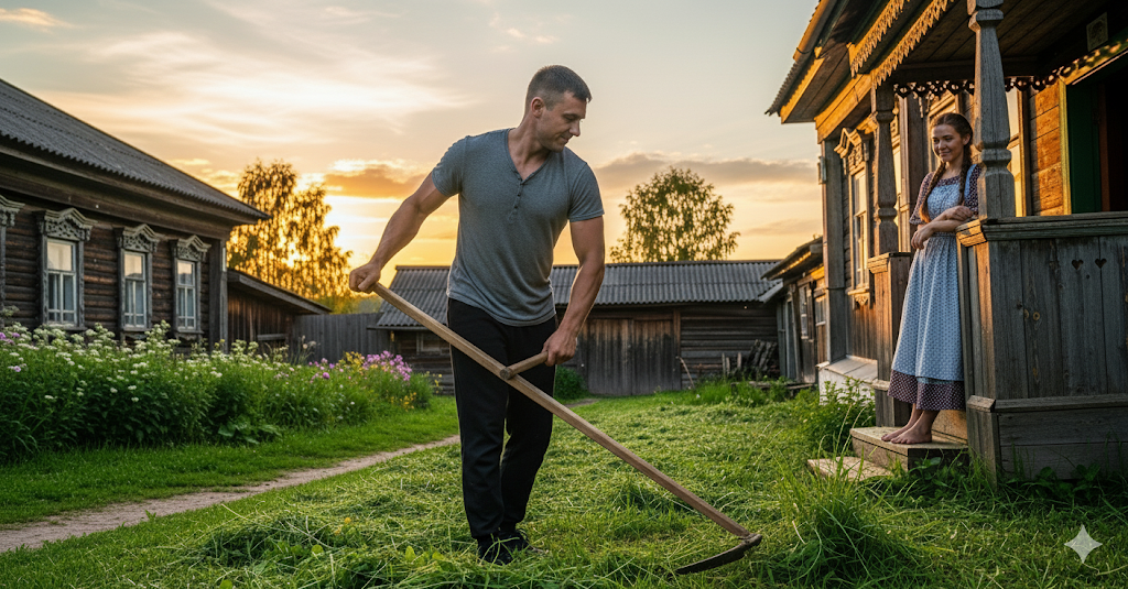 На следующее утро её разбудил незнакомый, но на удивление умиротворяющий звук — «вжик, вжик». Она подошла к окну и замерла от изумления. Во дворе, с могучим голым торсом, блестевшим от капелек пота на утреннем солнце, стоял Гриша. В его руках легко и ритмично ходила острая коса, срезая густой бурьян. К тому времени, как Марина успела умыться и одеться, весь двор был аккуратно выкошен. Он подошел к крыльцу.