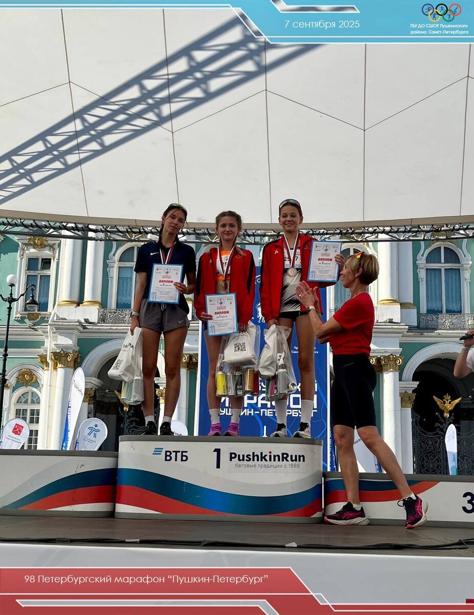 🌟98 ПЕТЕРБУРГСКИЙ МАРАФОН "ПУШКИН-ПЕТЕРБУРГ" 🏁7 сентября тысячи бегунов приняли участие в традиционном легкоатлетическом пробеге "Пушкин-Петербург". В этом году мероприятие прошло в 98-й раз и посвящено 80-летию Победы в Великой Отечественной войне. ⛳️Спортсмены преодолевали разные дистанции: 42,2 км, 30 км, 10 км и 5 км. 🏃♀🏃Старейший легкоатлетический пробег не только в России, но и в мире, впервые состоялся в 1923 году. Спортсмены нашей Пушкинской спортивной школы олимпийского резерва бежали 10 и 5 км. Вместе с нашими легкоатлетами в возрасте от 14 до 16 лет беговую трассу преодолела заместитель прокурора района Юлия Янковская. Все участники забега показали высокий уровень подготовки, улучшив свои личные рекорды и были награждены памятными подарками и медалями финишеров! 🏅 На дистанции 5 км 🥇Пшеничникова Мелета показала лучшее время среди девушек 14-19 лет, 🥉Охапкина Дарья заняла третье место. 👏Поздравляем наших спортсменок и тренера Павловскую Евгению Николаевну с пьедес