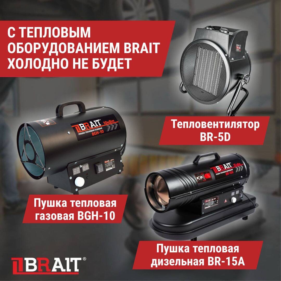🌬 С тепловым оборудованием BRAIT холодно не будет. ♨Тепловое оборудование BRAIT позволит Вам быстро и эффективно обогреть даже самое большое помещение. Некоторые устройства способны обогревать офисы, спортивные комплексы, бассейны и промышленные помещения. 👉 Сегодня мы расскажем об основных типах теплового оборудования BRAIT и попробуем разобраться в том, какая подойдет именно Вам. ➡ Электрические тепловентиляторы BRAIT. Могут работать от напряжения 220 и 380 В и потребляют мощность от 2 до 5 кВт. Тип нагревательного элемента: керамический. Их можно использовать в жилых помещениях. ➡ Газовые тепловые пушки BRAIT. Минимальная мощность газовых пушек составляет - 10 кВт, а максимальная - 81 кВт. В качестве топлива используется пропан или природный газ. ➡ Дизельные тепловые пушки BRAIT работают на дизельном топливе или керосине, поэтому их можно использовать на строительных объектах, в промышленных помещениях или гаражах вдали от городских коммуникаций. Мощность варьируется от 10 кВ