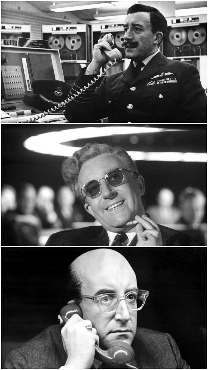 Педантичный, требовательный, серьёзный Стэнли Кубрик рыдал от смеха, снимая политическую сатиру «Доктор Стрейнджлав, или как я перестал бояться и полюбил атомную бомбу». Виной — комический талант ведущего актёра Питера Селлерса, который сыграл сразу три роли — обеспокоенного президента США Мёркина Маффли, полковника Мандрейка, пытающегося предотвратить ядерный коллапс, и монструозного политстратега Доктора Стрейнджлава. Абсолютно непохожие персонажи — типажи, характеры, акценты — оформлялись во многом благодаря импровизациям Селлерса, которые часто менялись в рамках одной сцены. Перфекционист Кубрик снимал дубль за дублем, а Селлерс периодически придумывал новые ходы, хотя и недоумевал, зачем переснимать так часто. Изначально он должен был сыграть и четвертую роль — техасского майора ВВС, командира бомбардировщика Дж.Т. «Кинг» Конга, но в конкретном случае Селлерсу тяжело давался акцент, а затем он повредил ногу, из-за чего не смог сниматься в тесной кабине. Майором Конгом стал Слим