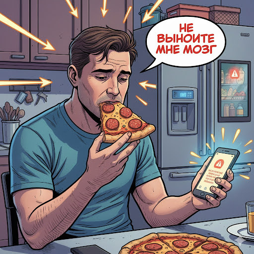 НЕ ВЫНОСИТЕ МНЕ МОЗГ Когда «умный» холодильник считает ваши калории Наконец-то пятница! Долгий рабочий день подошел к концу, и я чувствую, как усталость накатывает волнами. Единственное, чего хотелось – это расслабиться, заказать любимую пиццу и ни о чём не думать. Я захожу на кухню, открываю холодильник, чтобы достать любимый острый соус к пицце. И тут происходит нечто. Мой «умный» холодильник, эта жестяная коробка с искусственным интеллектом, с помощью встроенной камеры мгновенно распознает соус и отправляет мне на телефон уведомление: «Превышен суточный лимит калорий на 350 ккал. Рекомендуем отказаться от соуса. Для вашего здоровья.» Я в ярости хлопаю дверцей, чувствуя, как мозг начинает кипеть. Неужели даже в собственном доме я не могу просто поесть пиццу с соусом без осуждения? И, словно издеваясь, холодильник тут же добавляет голосом Алисы: «Дверца открыта более 15 секунд. Оптимизируйте потребление энергии. Климат в вашем регионе требует экономного подхода.» Я стою, ошарашенный