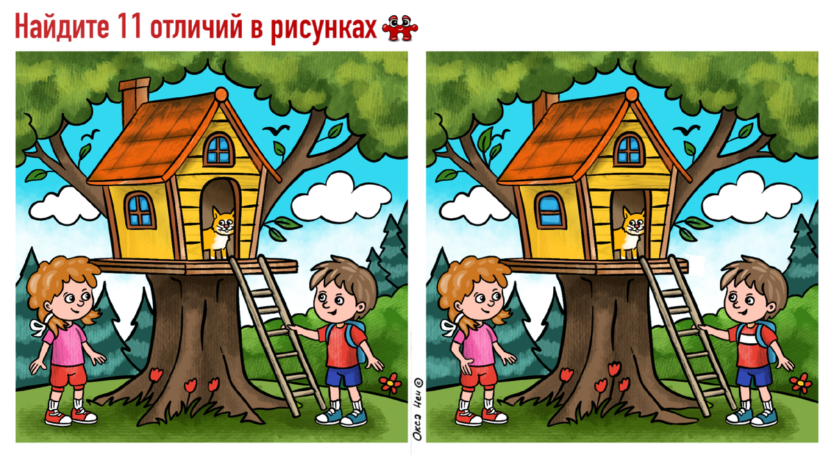 Всем доброго дня! Очередная яркая картинка переносит нас в летний сад с уютным детским домиком на дереве. Отличий как всегда 11. Старалась спрятать хорошо. Кто смог все найти? Горизонтальный тест: