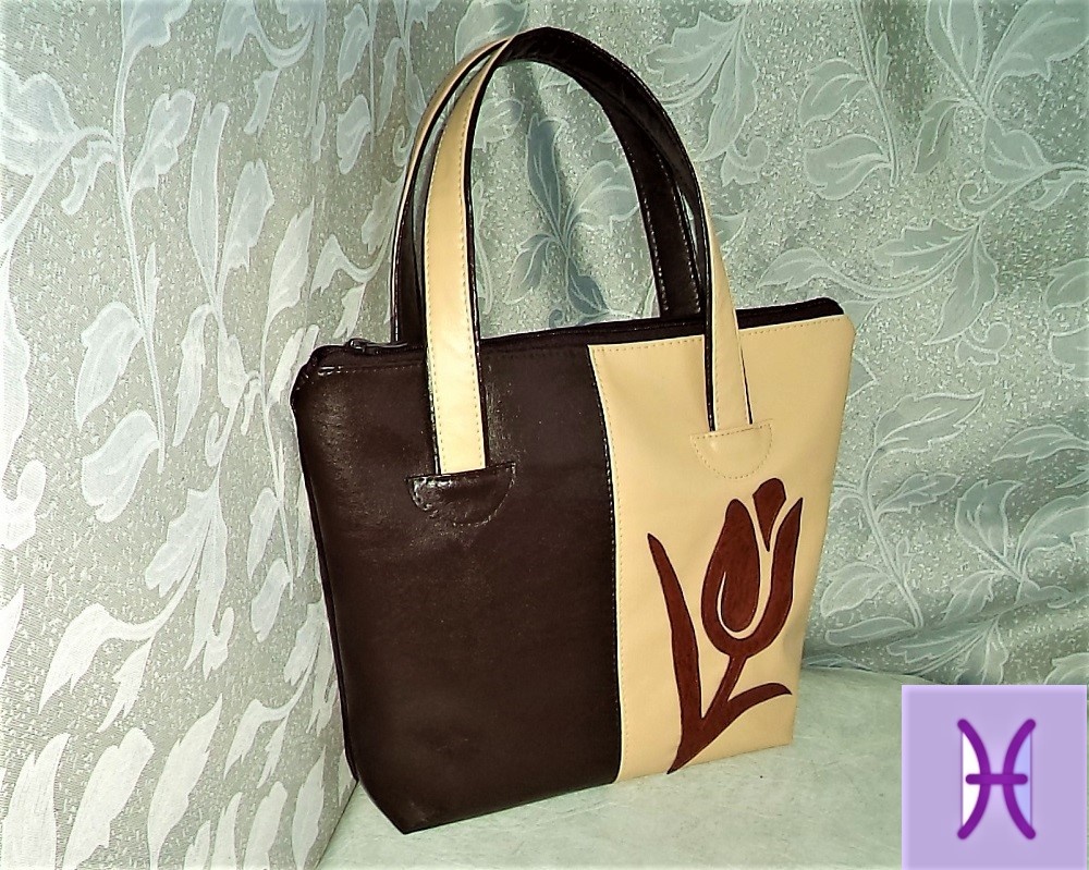 Приветствую всех подписчиков и читателей канала. Сегодня на повестке пошив повседневной сумки из искусственной кожи. Сумка будет с застежкой молнией, с подкладкой. Внутри одно большое отделение и три открытых кармана разной величины. Кожа для сумки у меня искусственная мебельная, не эко. По качеству кожа практически не уступает экокоже, а по цене почти в 3 раза дешевле. Сразу показываю итоговое фото сумки. А далее, всё по порядку. Как видно на фото, сумки сшита из двух цветов кожи - коричневой и сливочного цвета. Для упрощения я буду, в дальнейшем, называть их - темная кожа и светлая кожа. Специальной выкройки для сумки не требуется, так как все детали, это прямоугольники разного размера. Раскрой. Из темной кожи выкраиваем прямоугольник размером 38 см х 34 см - для задней стенки, прямоугольник 19 см х 34 см - половинка для передней стенки, 2 длинных прямоугольника размером 50 см х 5,5 см для нижней стороны ручек. Из светлой кожи выкраиваем прямоугольник размером 19 см х 34 см - половин