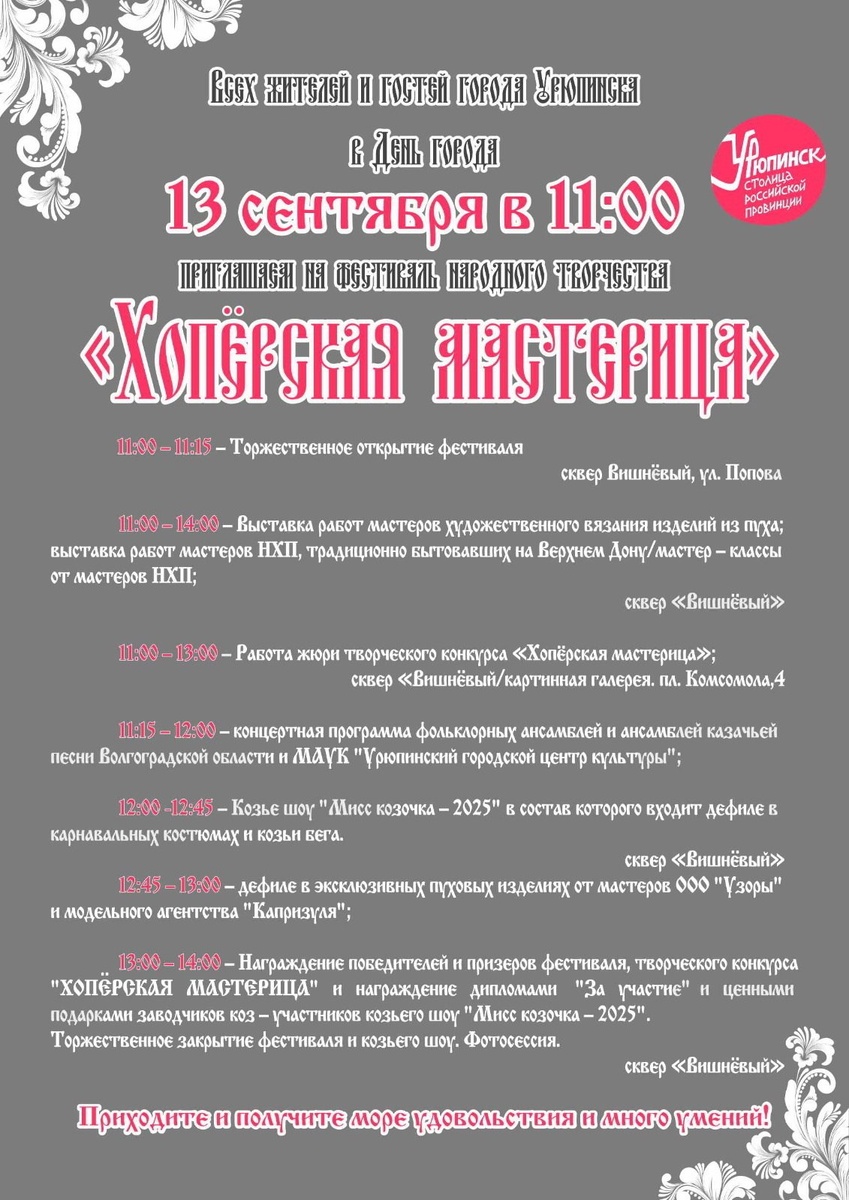 🎊Уважаемые жители города Урюпинска и Урюпинского района! 📌Организаторы конкурса мастеров художественного вязания изделий из пуха "Хопёрская мастерица" приглашают вас принять участие в конкурсе мастеров, показать свои умения и поделиться ими со всеми посетителями фестиваля народного творчества "Хопёрская мастерица", который состоится 13 сентября в г.Урюпинске в сквере "Вишнёвый".📍 👥Жюри оценивать ваши изделия ручной работы будут по трём номинациям: 1.Платки, шали, палантины выполненные традиционным способом; 2. Платки, шали, палантины, выполненные не традиционным способом (крючок, вилка, коклюшки); 3. Одежда с аппликацией и пр. ☺️Вас ждут отличные призы, красивые казачьи песни, козье шоу и общение с мастерами - единомышленниками! 📲Контакты для подачи заявки: Отдел культуры и туризма администрации г. Урюпинск, тел. 8 (84442) 4-35-82 #ДеньГорода #НовостиГорода #администрацияУрюпинска #СДнемРожденияУрюпинск #Урюпинск407