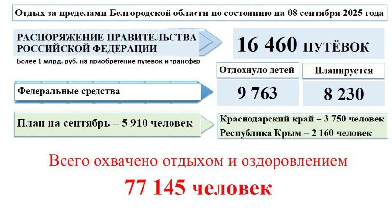 Вячеслав Гладков призвал муниципалитеты активнее распределять 8 000 путёвок для детского отдыха По распоряжению правительства РФ региону были выделены средства на 16 460 путёвок. 9 763 ребёнка уже отдохнули, 8 230 путёвок власти готовы предоставить. По словам замгубернатора – министра образования Андрея Милёхина, в планах на сентябрь – отправить на отдых 5 910 детей: 3 750 – в Краснодарский край и 2 160 – в Крым. Отметим, что прежде всего путёвки выделяют детям из приграничья и льготным категориям. Вячеслав Гладков отметил, что информирования о возможностях отдыха детей недостаточно. «Не было бы денег, не было бы решений, не было бы квот, но у на больше 8 тысяч путёвок. Вы для кого это бережёте?» – обратился он к главам муниципалитетов и призвал активнее работать с родителями. Всего по докладу главы Минобра, отдыхом и оздоровлением охвачены свыше 77 тыс. человек. 🟣В 399 пришкольных лагерях находилось 49 468 детей. 🟣В шести загородных – 2 967. 🟣В 232 лагерях труда и отдыха –