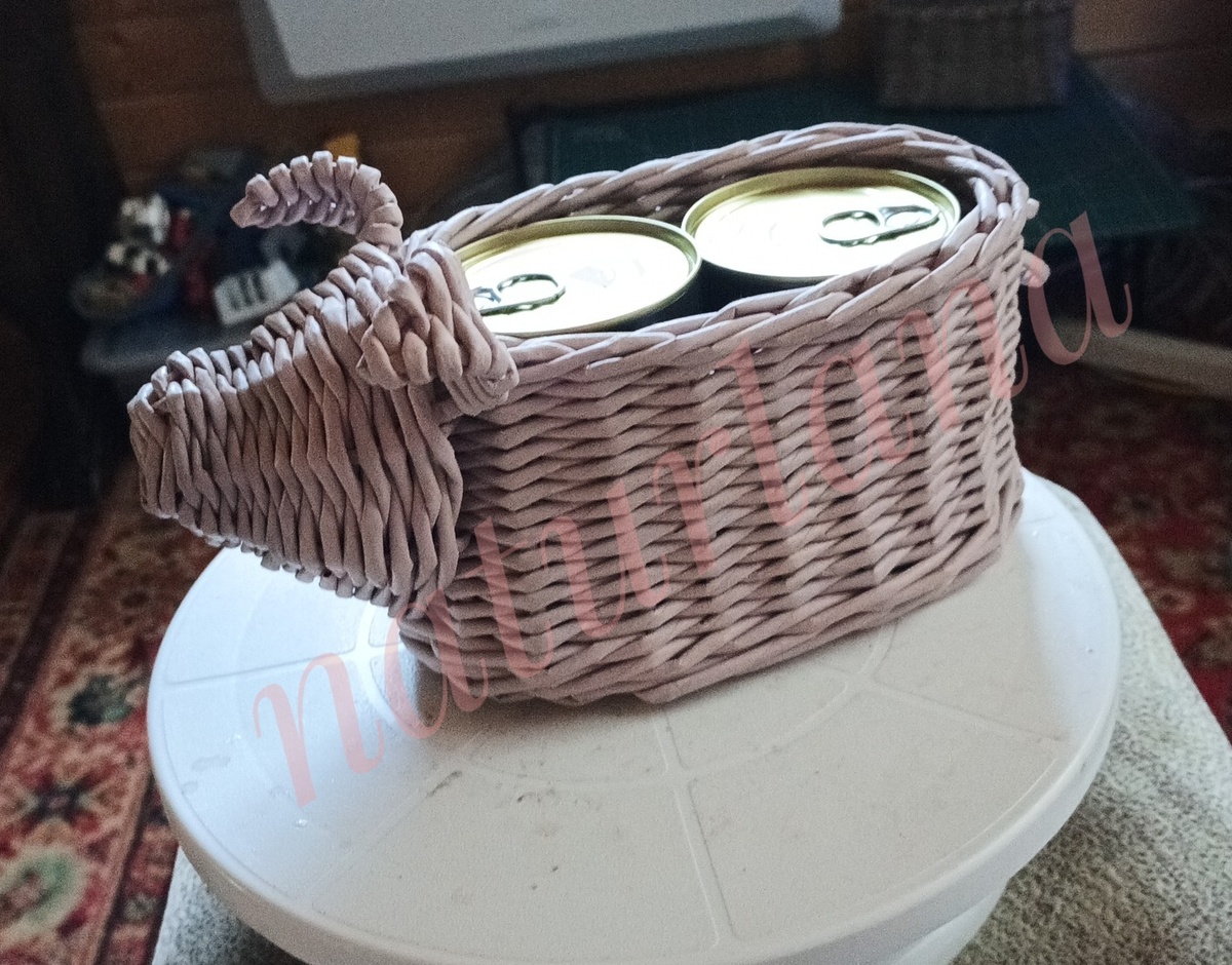 Я продолжаю учиться плетению. Сейчас чаще плету из бумажной лозы, чем из ротанга, так как ротангу нужно больше места, а я чаще бываю в городе. Вот такую хрюшку я сплела, чтобы упаковать в нее подарок. Подарок достаточно специфический и понятен только получателю, поэтому показывать содержимое баночек не буду — это не главное. Главное — сама свинка получилась просто отличной! Баночки отлично встали на свои места, а корзинку в виде свинки, надеюсь, владелец будет использовать для хранения разных мелочей. Идея создать именно такой подарок родилась буквально за несколько дней до вручения, поэтому пришлось быстро придумать, как добиться нужного розового оттенка. Для этого я использовала морилку цвета дуб, разбавленную морилкой берёза (белая), и добавила немного акриловой розовой краски. Других материалов с подходящим цветом у меня не нашлось, но результат меня полностью устроил — свинка получилась бледно-розового цвета, как и задумывалось. Сначала я подготовила пробного поросёнка, чтобы п