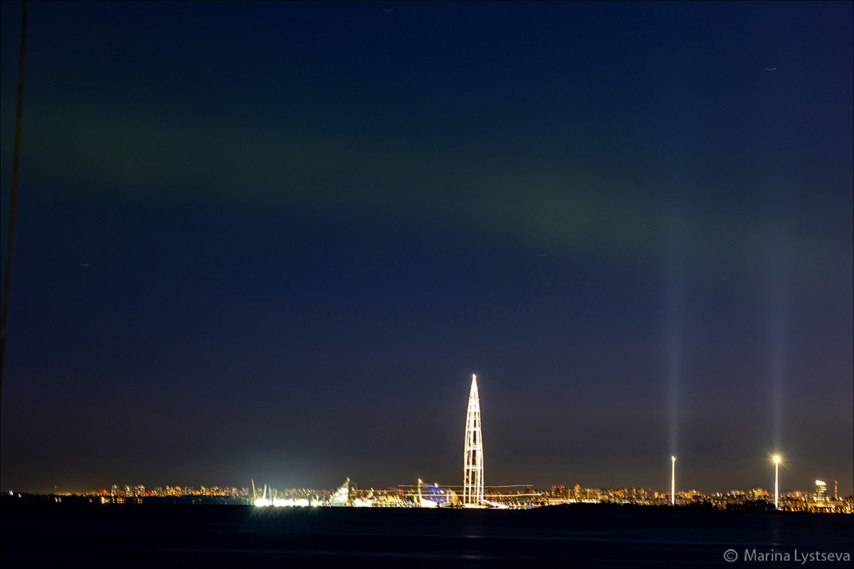 В середине прошлой неделе оказалась в Питере, чтобы поснимать садящееся за адмиралтейство солнце через Невский проспект, но опять не угадала со временем. Зато несколько человек написали, что в ночь со 2 на 3 сентября будет хорошая магнитная буря и нужно ехать снимать сереное сияние, которое будет видно даже из Москвы. Поехала в район Константиновского парка с видом на север и Лахту и вот что там показали: слабенькая полоска зелени из-за паразитной городской засветки практически не читается. Тогда по совету друга я рванула на берег Ладожского озера около посёлка Пятиречье - популярное место у питерцев, но для меня оно было новым. Тут сияло как не в себя! Но глазами такое тоже не увидишь: лишь слабые всполохи. А вот фотоаппарат распознал и выдал красоту на 30-секундной выдержке. За час наделала несколько картинок на две камеры: на одной фишай и на другой 24 мм. Фишай стоял и стрелял серию по 30 сек. в течение часа, 24 мм почти час на штативе и несколько отдельных ракурсов в конце съёмки.
