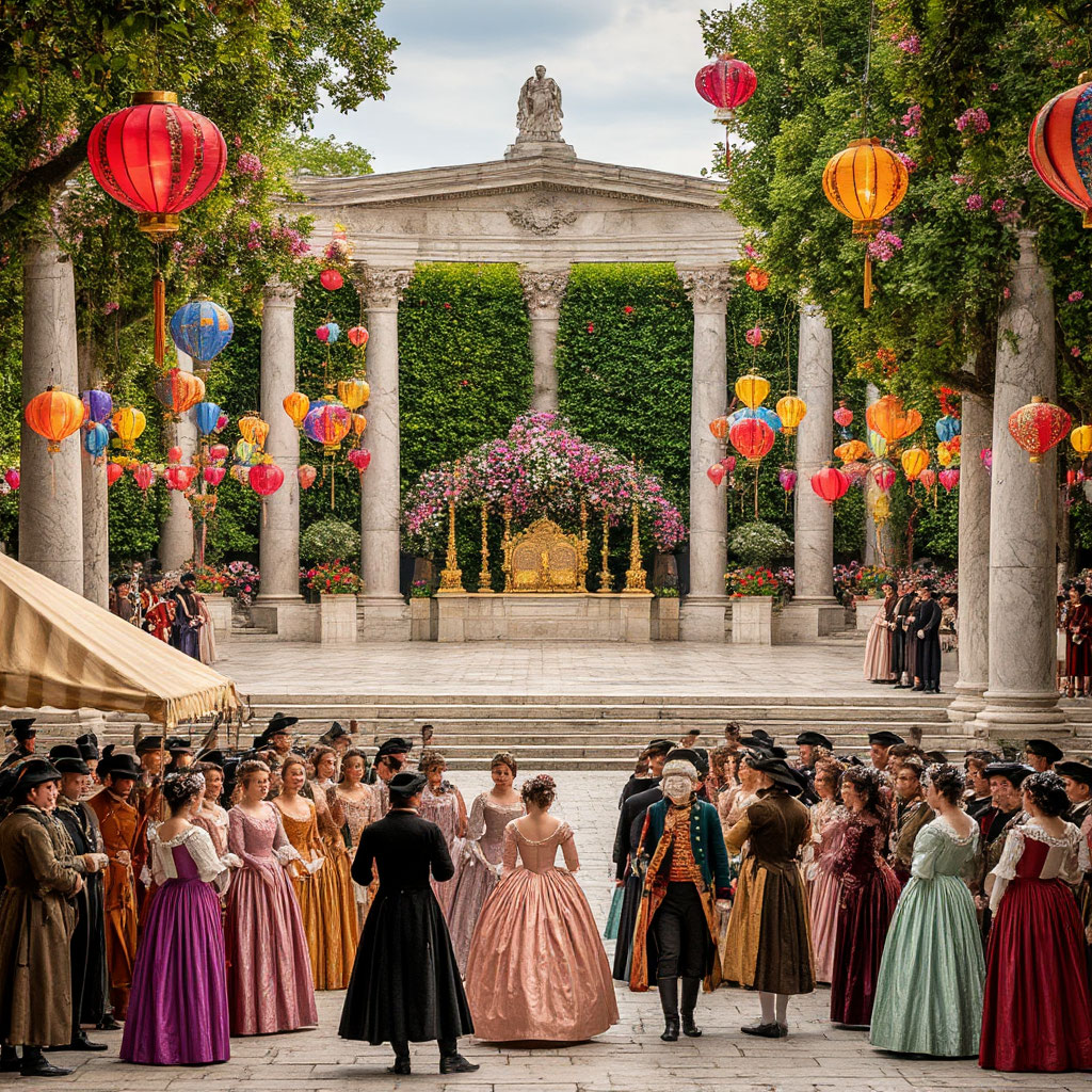 В центре находилась большая площадь, обрамленная высокими мраморными колоннами и цветущей живой изгородью. Везде висели разноцветные фонарики, стилизованные под фигурки людей, животных, цветов. Нежные романтические мелодии играл большой духовой оркестр, мимо которого мы как раз проходили. Справа от нас на краю площади находилось невысокое возвышение с четырьмя королевскими тронами, над которым был натянут яркий широкий тент. По площади и парку прогуливались группы празднично одетых людей, ожидая начала бала.