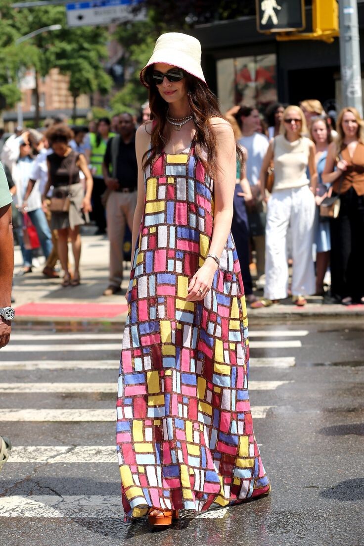 Это тот самый бохо-шик, но на максималках. Свободный крой, яркий, но не кричащий рисунок. Идеально смотрится с массивными сандалиями на платформе — у нее, кстати, это Chloé. Да, для обычной жизни такое платье — вещь смелая. Но ведь нам никто не мешает вдохновиться самой идеей: не бояться сложных принтов и сочетать их с простой, удобной обувью.