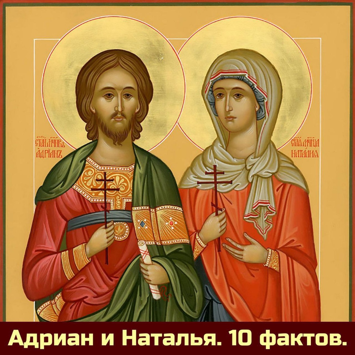 Святые мученики Адриан и Наталия. 10 фактов о них. 1. Адриан и Наталия, молодая супружеская пара, жили в Никомидии Вифинской. 2. Это было во времена одного из главных противников христиан, императора Максимиана. 3. За свою любовь друг к другу и верность христианскому вероучению страдальцы были причислены после смерти к лику святых. Наталья. 4. Великомученица никомидийская была тайной христианкой. Она вышла замуж за язычника и скрыла от мужа свою веру. Когда муж объявил себя христианином, он принял мучение за измену языческим богам. Жена призналась ему, что они теперь единоверцы. Она поддерживала его во время страданий, ободряя духовно и ухаживая за ранами. 5. Когда Адриан был отпущен домой перед казнью, Наталья не хотела видеть его, думая, что он поддался на уговоры вернуться в язычество. Но, узнав о дате казни, была рядом с Адрианом до последней минуты. 6. После его смерти она отправилась на корабле в Византию. Во сне Наталия увидела мужа, который сообщил о скором успокоении