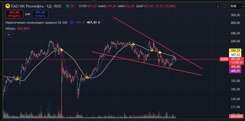 #ROSN #РОСНЕФТЬ 📊 Строит сужающийся канал, очень вероятно, что это клин. Пока что фигура до конца не построена, есть шанс немного сходить наверх, а дальше спуститься вниз до нижней стенки. ✅Верхняя стенка предположительно 484,7, нижняя стенка 383. 🟢Такой клин говорит нам о приближающемся развороте и начале восходящего движения после подтверждения фигуры. 🔼 Подтверждением фигуры будет пробитие верхней стенки. ↗️ Глобальный тренд восходящий. НЕ ИИР