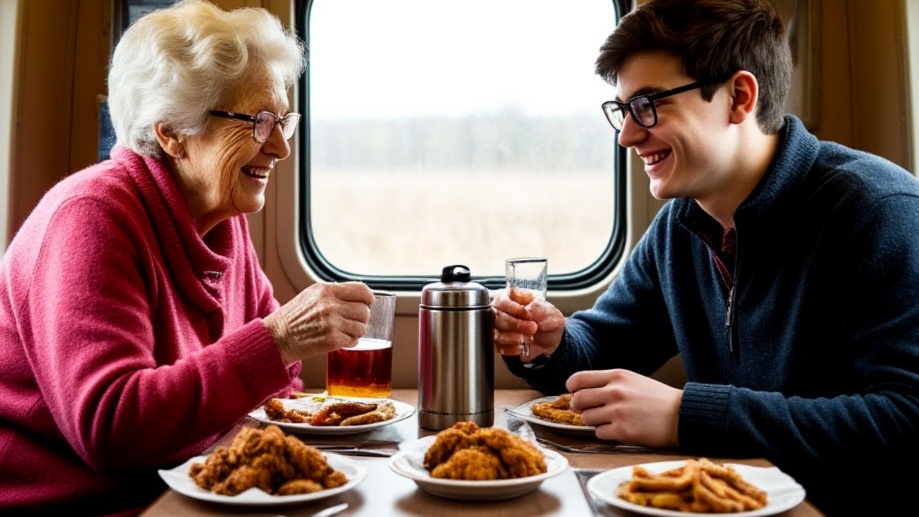 Пассажиров больше в нашем отсеке не было. До самой конечной станции мы ехали вдвоём. Похоже, что мало кому хотелось ехать в это время на юг, кроме нас с бабушками, у которых родственники живут там. В итоге я не пожалел ни капельки, что вместо сыночка со мной ехала его мама. Она достала из сумки (нет не пирог с капустой, читатели запретили мне брать с собой румяные пироги и загорелые бублики с чаем со слоном) жареную курочку в духовке. Бережно разложила на фольге. Отломила ломтик домашнего ароматного вкуснейшего хлебушка с хрустящей корочкой и мягким мягким внутри.