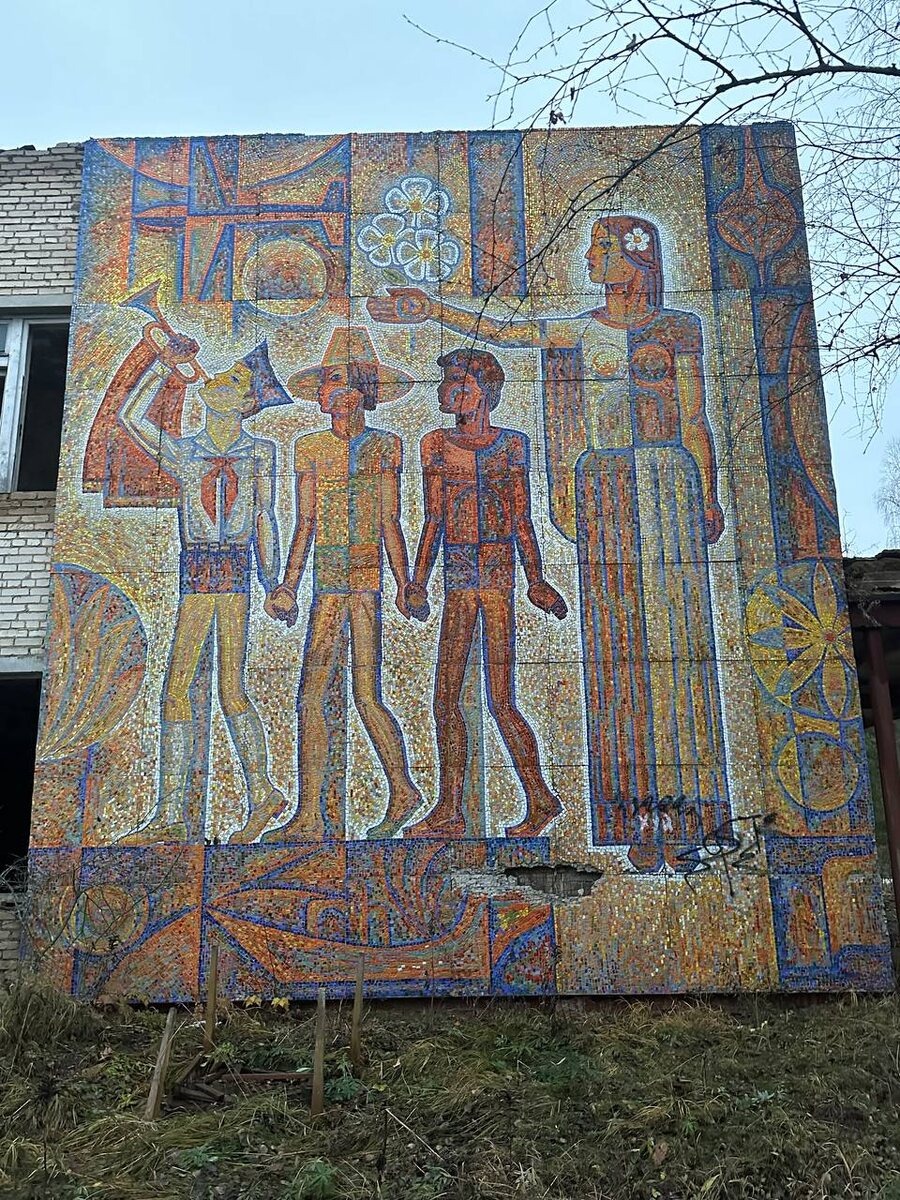 Жуков. Советские мозаики в заброшенном пионерлагере. Недалеко от Обнинска находится городок Жуков - родина великого маршала, кончившего дни свои глухо в опале, как Елизарий или Помпей. На окраине Жукова расположен детский оздоровительный лагерь "Солнечный" имени Жукова. Вернее расположено то, что от него осталось. Главный корпус здания покрыт монументальными мозаичными панно. Советская богиня счастья и плодородия указывает держащимся за руку пионерам путь в светлое будущее. Хлебосольная кормилица и радостный мальчишка встречают гостей. 📱 Архитекстура #Жуков #Калужскаяобласть