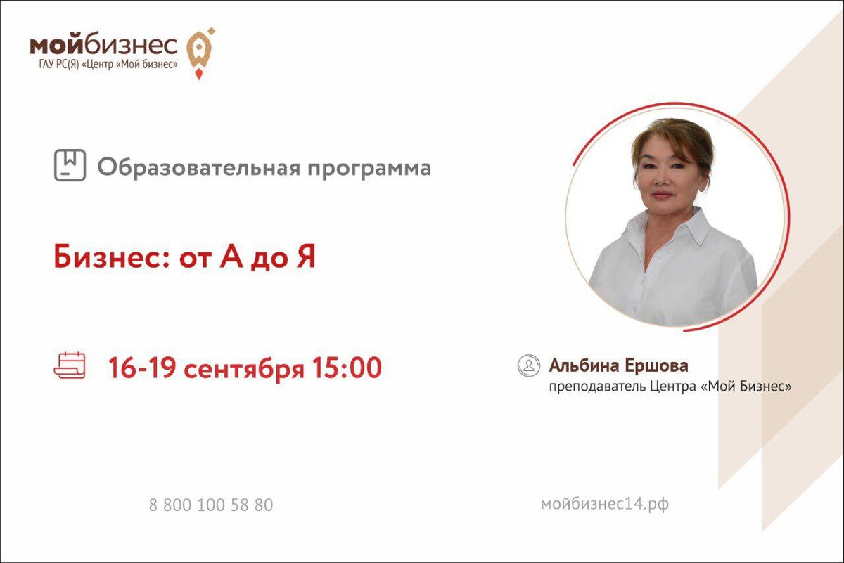 🚀Центр «Мой Бизнес» приглашает принять участие в образовательной программе «Бизнес: от А до Я». 🌟Программа «Бизнес: от А до Я» предназначена для потенциальных и начинающих предпринимателей по обучению навыкам создания бизнеса с нуля. ⚡Участники тренинга получат: - Знания в области юридических аспектов, маркетинга, калькуляции, финансового планирования; - Методы разработки бизнес-плана; - Инструменты анализа; - Полезные источники информации для бизнеса. 🎙️Спикер: Альбина Ершова, преподаватель Центра «Мой бизнес». 🗓️Дата: 16-19 сентября 2025 г. 🕛Время: с 15:00 ч. 🧑💻Формат обучения: онлайн 🔗Ссылка для регистрации: https://forms.yandex.ru/cloud/68b4f7e84936392393c1bb32/ ✔️Участники тренинга получат сертификат установленного образца @moibizsakha