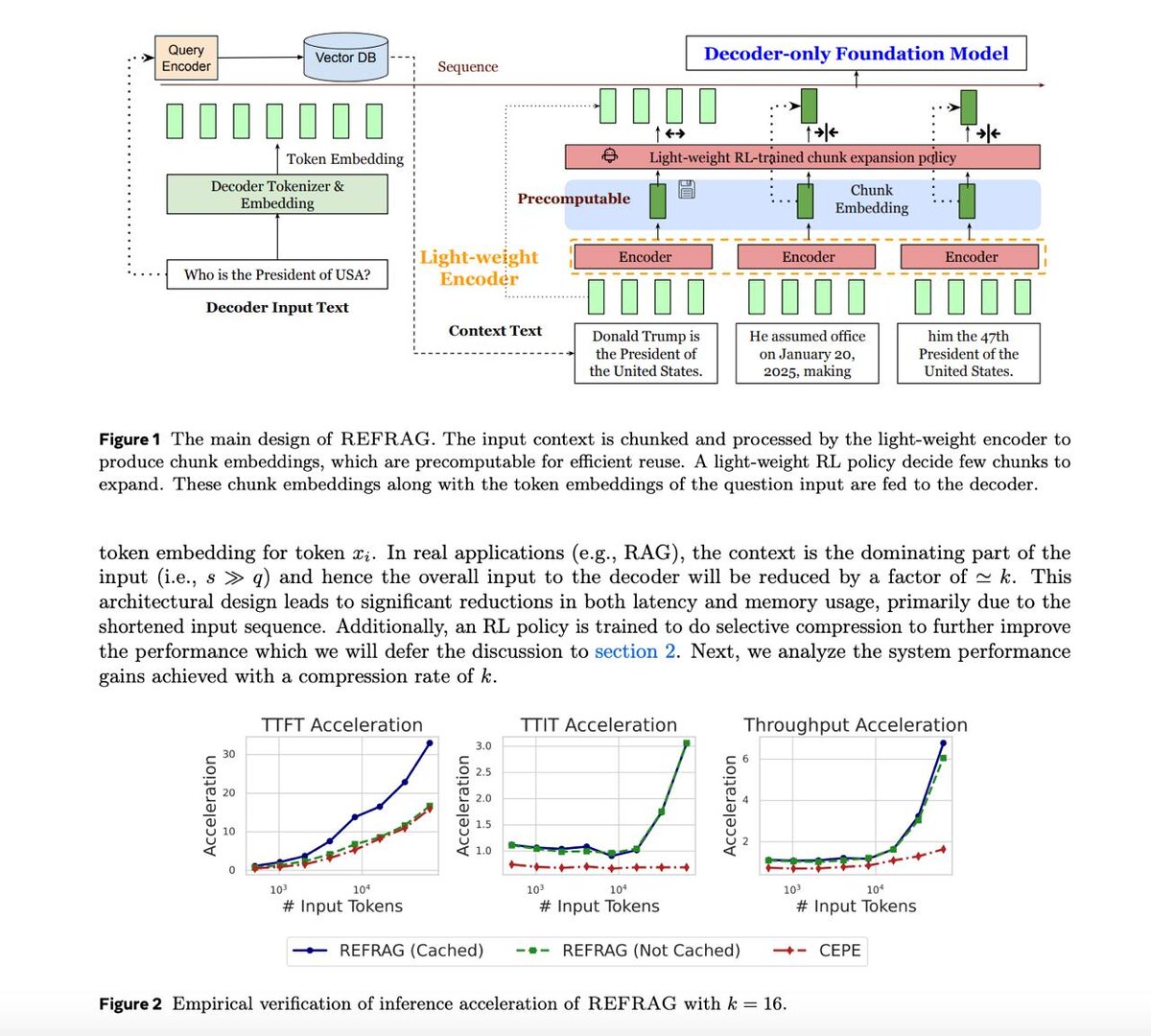 ⚡️ REFRAG: новое поколение RAG REFRAG ускоряет работу Retrieval-Augmented Generation, сжимая контекст в chunk embeddings, сохраняя качество ответов. 📌 Результаты: - До 30.85× быстрее первый токен - До 16× длиннее эффективный контекст без потери точности 🔍 В чём идея: Обычные RAG-промпты вставляют кучу текстов, половина из которых не нужна → модель тратит вычисления впустую. REFRAG заменяет токены этих текстов кэшированными эмбеддингами, подгоняет их под размер декодера и подаёт вместе с вопросом. Последовательность короче → внимание масштабируется по чанкам, а не по токенам → меньше памяти уходит на KV-кэш. 🎯 Как работает: - Большинство чанков остаются сжатыми. - Специальная политика выбирает, какие именно разжать обратно в токены, если важна точная формулировка. - Обучение идёт в 2 шага: сначала модель учится восстанавливать токены из эмбеддингов, потом продолжается предобучение с задачей прогнозирования следующего абзаца (постепенно увеличивая размер чанков). - Полити
