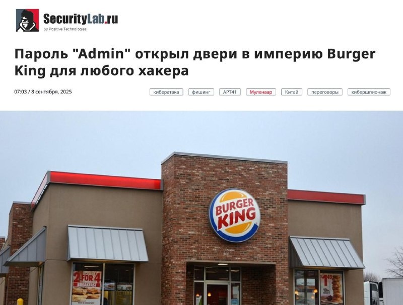 Белые хакеры сумели получить доступ к 30 000 ресторанам Burger King, воспользовавшись паролем «аdmin», обнаруженным в коде сайта. Эта уязвимость позволяла им получить доступ к аккаунтам сотрудников, системам заказов и даже прослушивать записи разговоров на «драйв-тру». Кроме того, через административные интерфейсы можно было управлять планшетами в ресторанах, отправлять уведомления и оформлять заказы на оборудование. Коллеги, постарайтесь улучшить безопасность, добавив цифры в пароль. Например, можете использовать «admin321». Дополнительную информацию можно найти здесь. Наш уютный канальчик 🤖 Анимация | СhatGPT-4 | Помощь с резюме