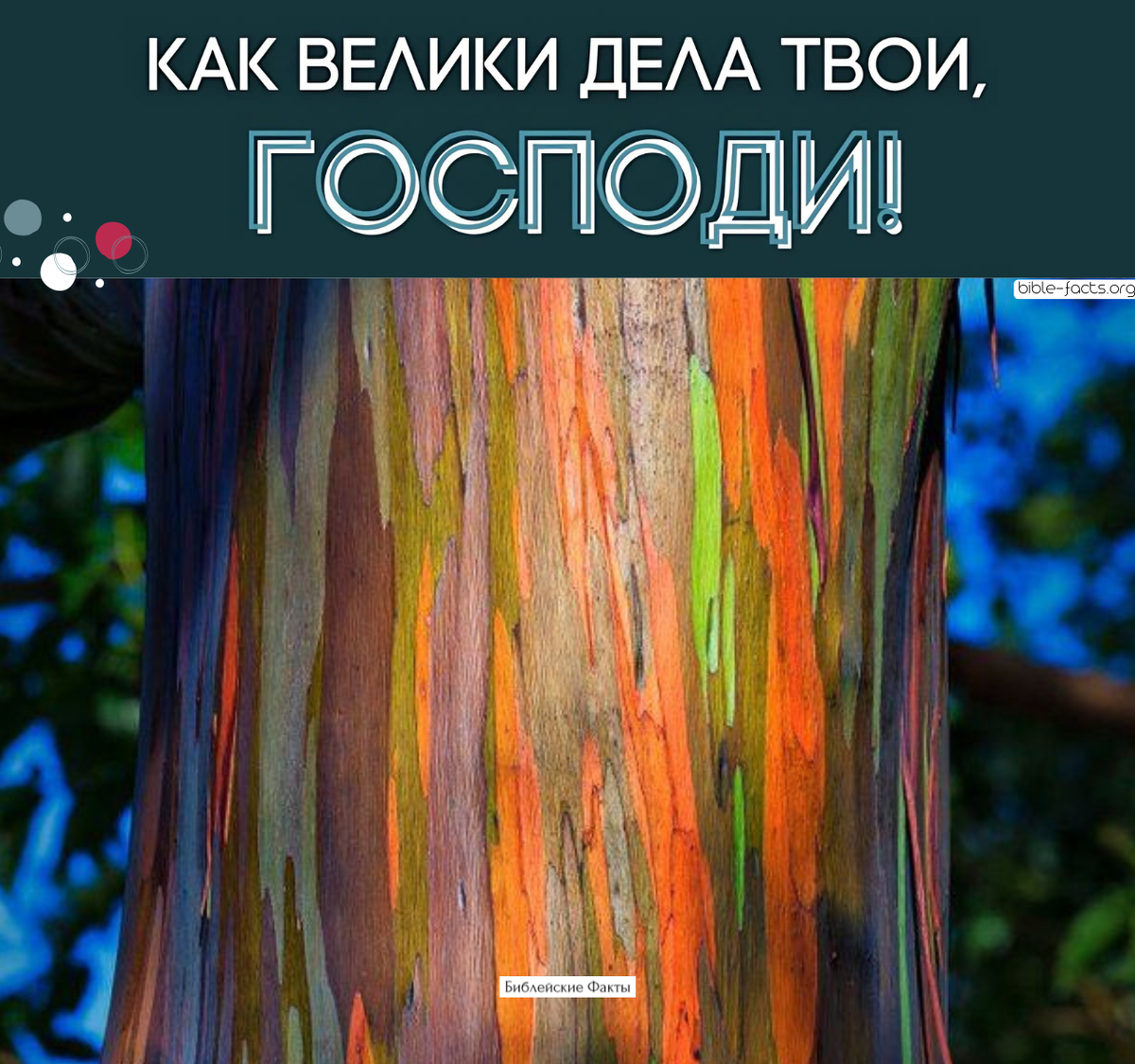 Его кора словно живая радуга — зелёная, оранжевая, синяя, бордовая... и это не выдумка, а Божье творение! Когда смотришь на него, хочется воскликнуть: "Господи, как дивны дела Твои! Радужный эвкалипт — одно из самых красивых и необычных деревьев на Земле. Его ствол каждый сезон меняет цвет, словно Творец Сам обновляет палитру. Поделись этим постом, если тебя тоже восхищает Божья красота в творении! • Телеграмм канал (Библейские факты) • Больше интересных Библейских Фактов (VK) • Библейские факты (сайт)