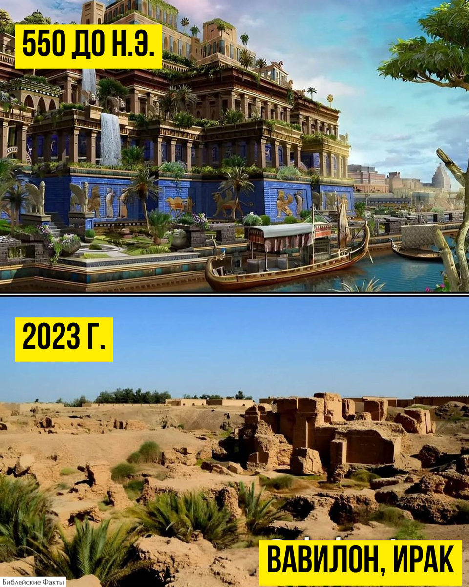 Перед вами иллюстрация Вавилона – каким он был в древности и каким стал сегодня. Один из величайших городов древнего мира, столица Вавилонской империи. В Библии Вавилон упоминается как место строительства Вавилонской башни (Быт. 11:1–9), а также как центр, куда был уведен народ Иудеи во время пленения (4 Цар. 24–25). Пророки Исаия и Иеремия предсказывали его полное разрушение (Ис. 13:19–22; Иер. 50–51). Сегодня от некогда великого города остались лишь руины в современном Ираке, подтверждая исполнение пророчеств. • Телеграмм канал (Библейские факты) • Больше интересных Библейских Фактов (VK) • Библейские факты (сайт)