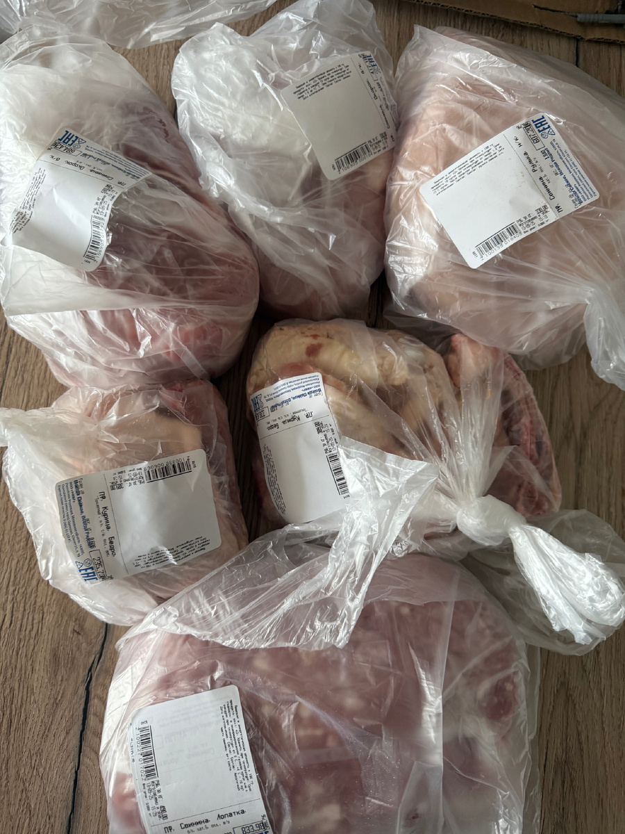 Я продолжаю закупаться продуктами. Делаю в основном запас мяса. На фото - рас члененка из Мясницкого ряда: Рулька для запекания. Потом на косточке из нее сварю суп. Куриные бедра, мякоть окорока в двух пакетах, и фарш из лопатки. Фарш попросила накрутить на месте, прямо в магазине. Заняло около 10 минут, разница в весе составила 50 грамм (на общий вес около 1800 г.), что вполне допустимо. Мне, кстати, стоимость пересчитали с учетом уменьшения массы. Часть купленного отгрузила старшему студенту. Цены и вес видны на этикетках. Конечная стоимость за все составила 2289 рублей с учетом моей скидки, 44 рубля вернулось кэшбэком. Пятерочка. В нее заходила 2 раза. Первый раз целенаправленно покупали курятину для старшего студента. И ровно в этот момент произошел сбой в красном банке! Я не смогла оплатить его картой и воспользоватьсякэшбэком. Заплатила Сбером, сумма покупки составила 1026 рублей, куплено чуть более килограмм филе. Я недовольна. Но, видимо в качестве компенсации на текущей неделе