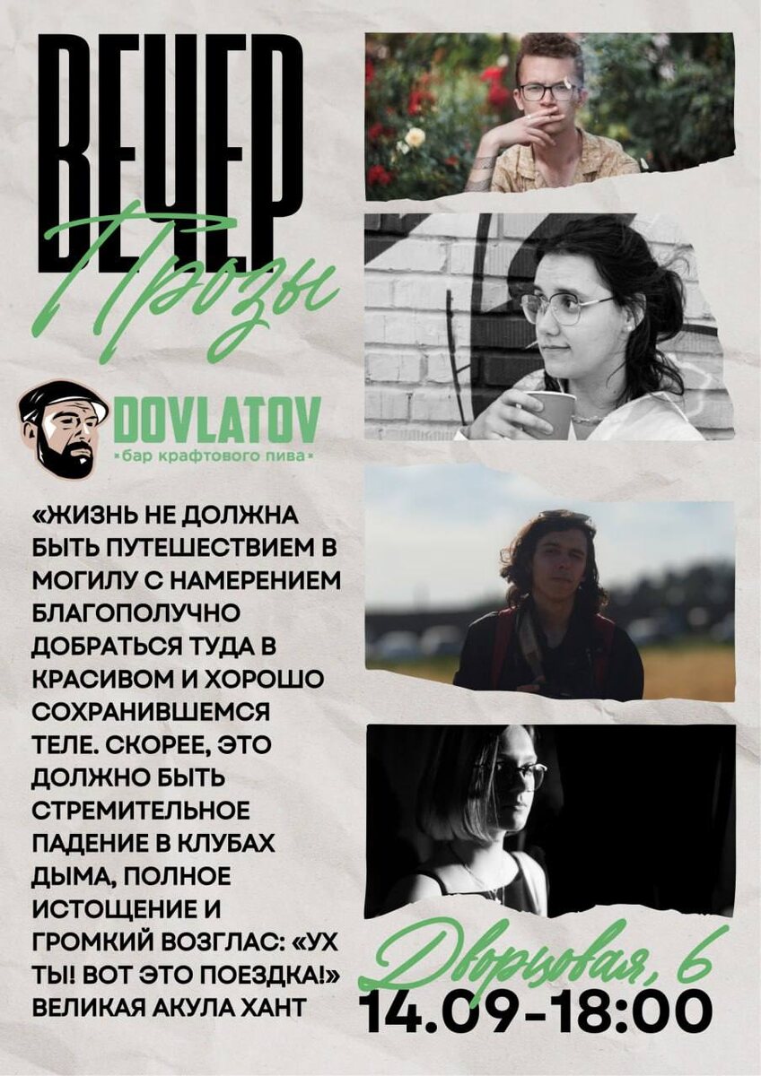 Вечер прозы 🗓️ 14 сентября, сбор гостей в 17:30, начало в 18:00 📍бар Довлатоа Ульяновские авторы читают свои произведения на публику. Короткие и не очень рассказы разного направления: воспоминания, в которых смешиваются прошлое и будущее, неожиданная встреча в неожиданном месте, бытовая сказка— всё, что угодно, но главное — не скучно. Список выступающих: Владислав Лазарев, Дарья Гаврилова, Ева Дабакорова и Давид "Панк" Элли Все выступления пройдут под музыкальный аккомпанемент Артура Иванова. 🏷️ напиток на баре или донат 300₽ Бронирование столов по номеру: +79084890770 #14сентября25