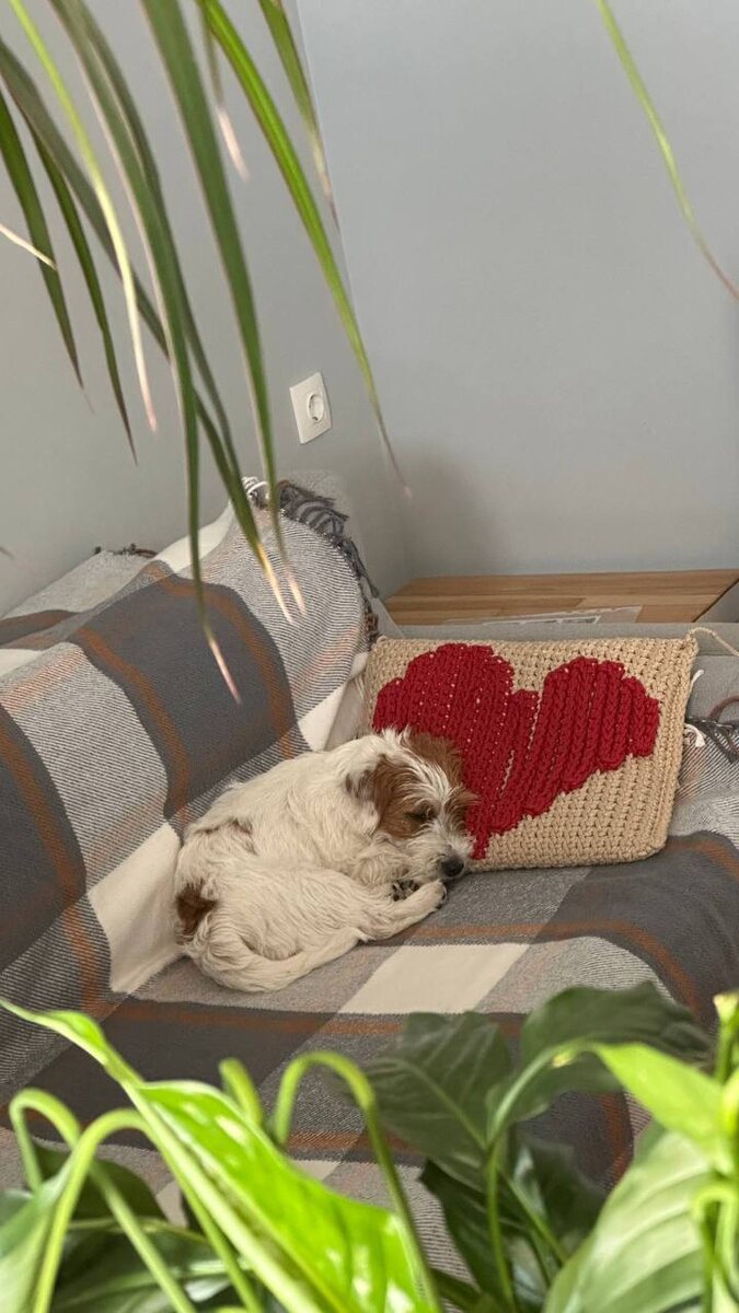 Цветы растут, собака спит, плед удобный, подушка мягкая.