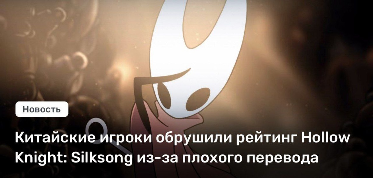 Китайские игроки обрушили рейтинг Hollow Knight: Silksong из-за плохого перевода Пользователи из Китая начали массово снижать рейтинг Hollow Knight: Silksong в Steam после выхода игры. Главной причиной стало недовольство качеством перевода на китайский язык. Многие жалуются на неверные и непонятные формулировки, а также на множество ошибок, которые сильно портят впечатление от игры. Разработчикам уже поступают просьбы пересмотреть локализацию и улучшить качество перевода. Пока неизвестно, как ситуация повлияет на дальнейшую популярность проекта, но ясно одно — хорошие переводы играют важную роль в успехе игр на международном рынке.