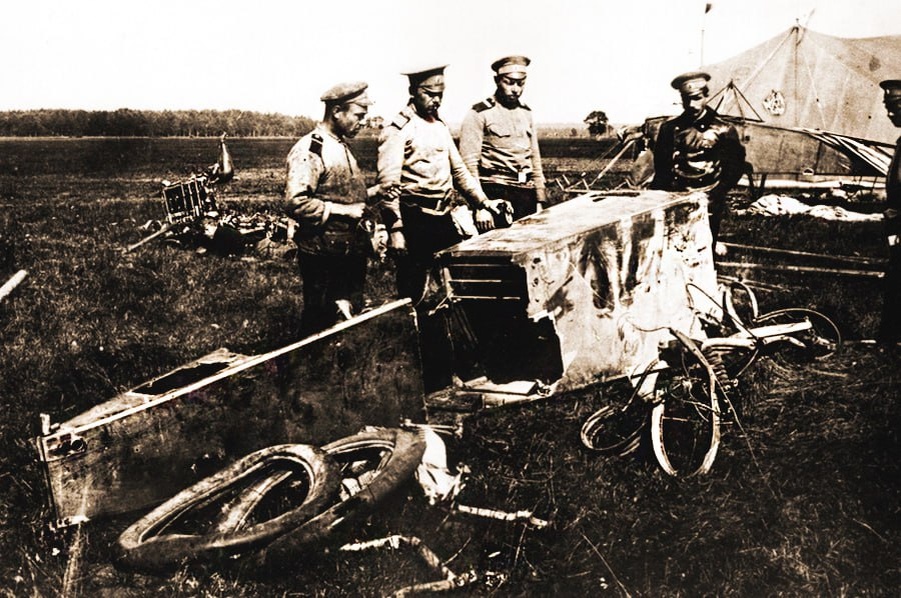 Русские солдаты осматривают остатки сбитого Нестеровым «Альбатроса», август 1914 год