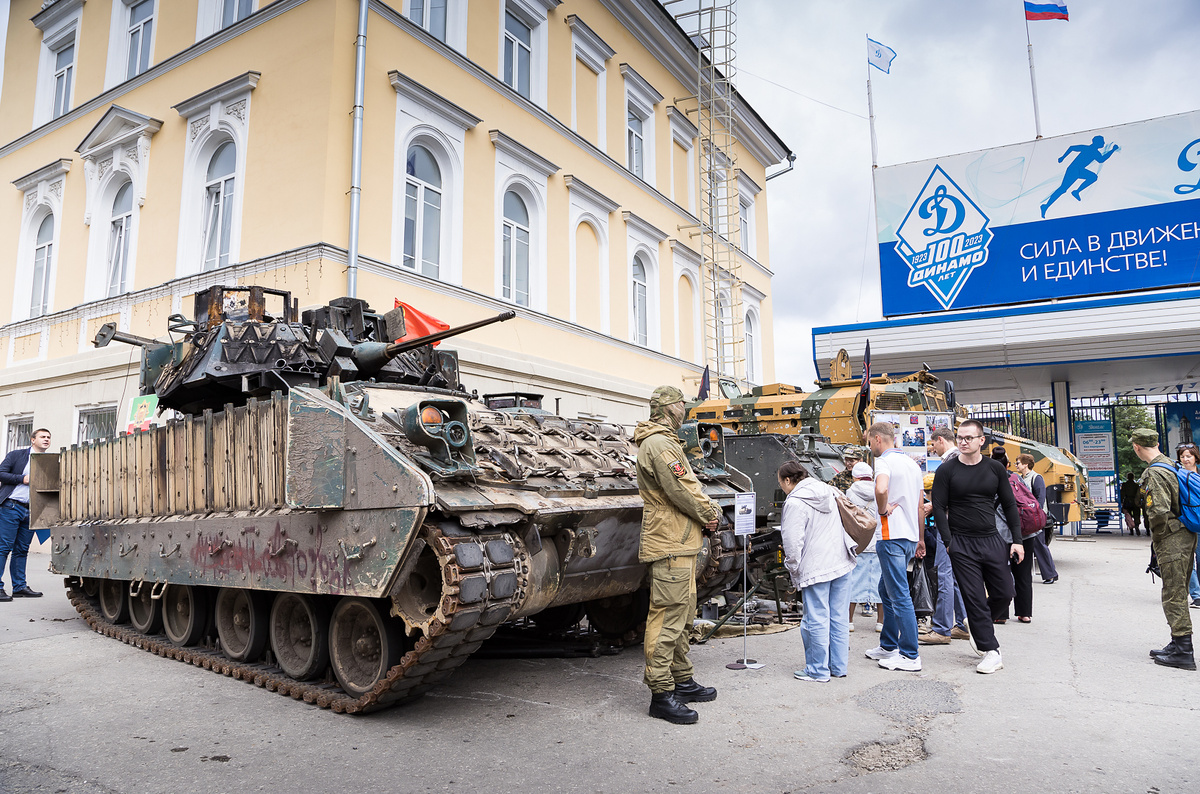 В пятницу, 5 сентября, на стадионе «Динамо» в Саратове прошло торжественное мероприятие, посвящённое вступлению новых «динамовцев» в ряды этого общества. В честь этого на площадке перед стадионом была выставлена военная техника — отечественная и зарубежная трофейная из зоны боевых действий на территории Украины, всего — 7 единиц техники, а также образцы вооружения. Ряд отечественной военной техники был представлен четырьмя единицами — 2 бронетранспортёра БТР, а также бронеавтомобили «Тигр» и «Патруль». Особый интерес среди посетителей выставки вызвала зарубежная военная техника, причём не просто техника, а техника трофейная: её бойцы Вооружённых сил России заполучили в ходе боевых действий на территории Украины. В самом сердце Саратова была выставлена боевая машина пехоты M2 «Bradley», а также американский бронетранспортёр M113 и турецкий бронеавтомобиль «Kirpi». Помимо техники, посетители могли ознакомиться с оружием — винтовками, пушками и прочим. Вся техника и вооружение, которое бы